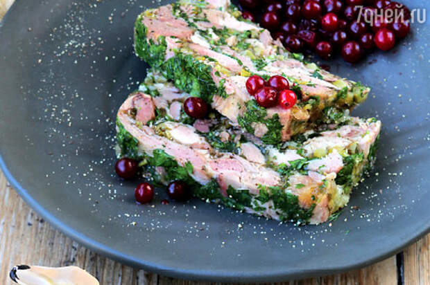 «Родина террина — Франция. Это оригинальная холодная закуска, получившая название от прямоугольной формы для запекания. Террин — нечто среднее между запеканкой и паштетом. Русским гурманам террин больше знаком как запеченный рулет. Он идеально подходит как нежная холодная закуска для больших столов.