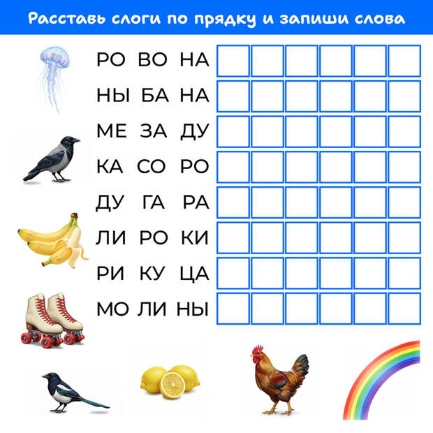 Упражнение «Расставь слоги по порядку и запиши слова» стимулирует беглость речи и навыки чтения. А если малыш уже умеет писать буквы, то игра будет полезна еще и для развития навыков письма.