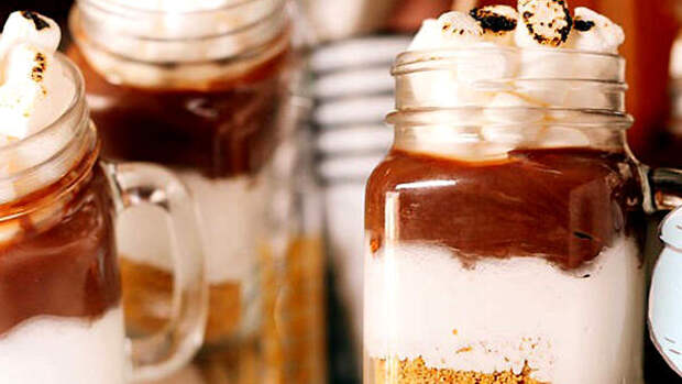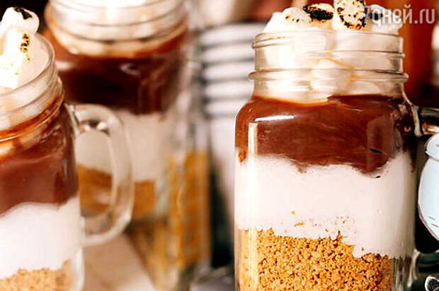 - На дно стеклянного стакана положите три ложки измельченных крекеров, затем две ложки ванильного мороженного и две ложки жидкого шоколада.