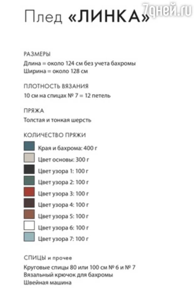 Размер пледа «Линка» – около 124 см на 128 см, без учета бахромы. Чтобы связать такой плед, убедитесь, что у вас есть пряжа в количестве, указанном на фото номер 4: