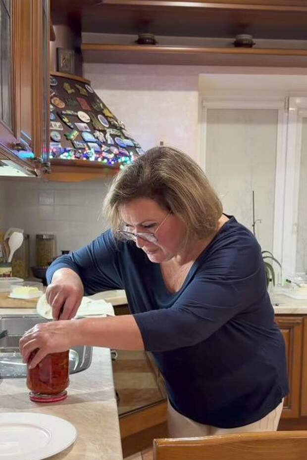 Позже Ксения показала, как члены семьи Сердюкова готовятся к застолью с домашними заготовками. Она сама в это время изучала фотоархив — с интересом разглядывала детские фото Николая.