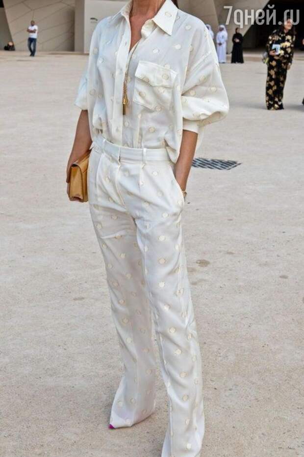 Дополните образ прямыми брюками или палаццо (смотря какой фасон вы обычно предпочитаете) и цветными лодочками. Как свита делает короля, так и ансамблю придают шика интересные аксессуары. В этот день смените шоппер или тоут на более элегантные сумочки — объемный клатч или милый сундучок на длинной цепочке будут как нельзя кстати.