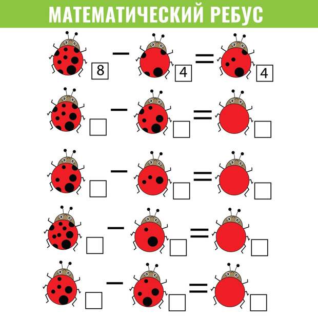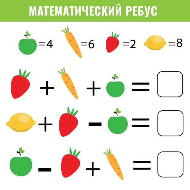 В них нужно расставить математические знаки так, чтобы равенство стало верным.Самыми популярными вариантами математических ребусов являются головоломки с неполными примерами, где нужно просто вставить недостающий знак. Другой разновидностью таких задач являются таблицы, где цифры заменены изображениями, символами или просто пропущены.