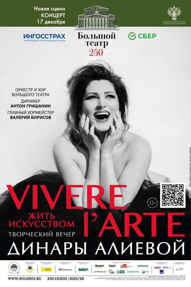 Одним из самых ярких событий юбилейного, 250-го сезона Большого театра станет юбилейный вечер Динары Алиевой «Vivere l’arte» (Жить искусством), который пройдет 17 декабря на Новой сцене в сопровождении симфонического оркестра и хора Большого театра. В программе торжественного вечера войдут арии из опер Верди, Пуччини, Гершвина и Чилеа.