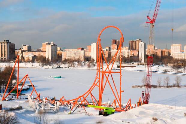 Следующий этап доставки включает в себя оставшиеся детали и поезда, которые будут готовы к монтажу уже весной. Сейчас мы завершили монтаж самой высокой точки аттракциона, которая сравнима с 17-этажным домом.