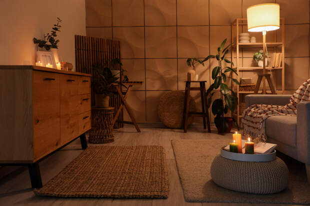 Теплый мерцающий свет ассоциируется у мозга с безопасностью и теплом. Свечи, биокамины, небольшие гирлянды или лампы с эффектом пламени усиливают выработку дофамина, поэтому, кстати, их так хочется включать именно зимой. Очень хорошо они работают в связке с мягким текстилем и естественными материалами.