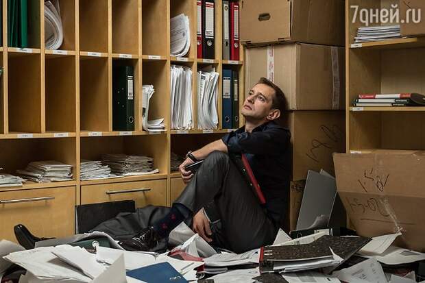 Константин принес на площадку две корзины на выбор: одну мы закрепили на дверь, сделав таким образом еще и мишень для бросания скомканной бумаги. В одной комнате мы собрали более двухсот килограммов макулатуры, свою лепту внесли и настоящие коллекторы, поделившиеся с нами своей бумагой. Итогом этого сбора стала сцена в архиве, которую мы снимали почти 20 минут, в течении которых Хабенский ищет нужный документ и буквально тонет в бумаге. К счастью, никто за время съемок не пострадал».