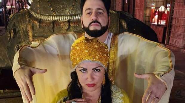 В ОАЭ Нетребко приняла участие в оригинальном костюмированном вечере и появилась перед собравшимися в наряде восточный красавицы – в просторном балахоне, золотом платье в пол и чадре. Она сделала яркий макияж и распустила темные волосы, чтобы придать своему облику еще больше выразительности. Супруг Анны облачился в похожую накидку, только чуть менее кричащую, и оставил голову непокрытой, позволив жене блистать на его фоне.