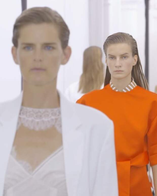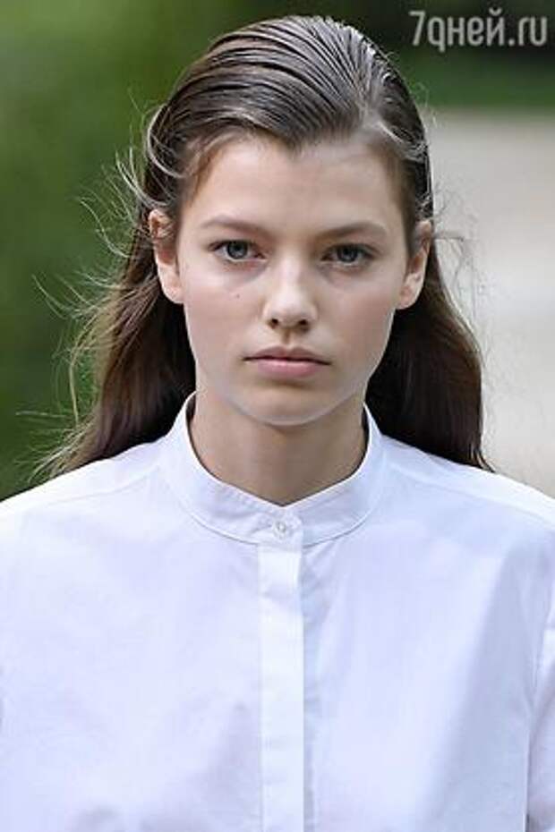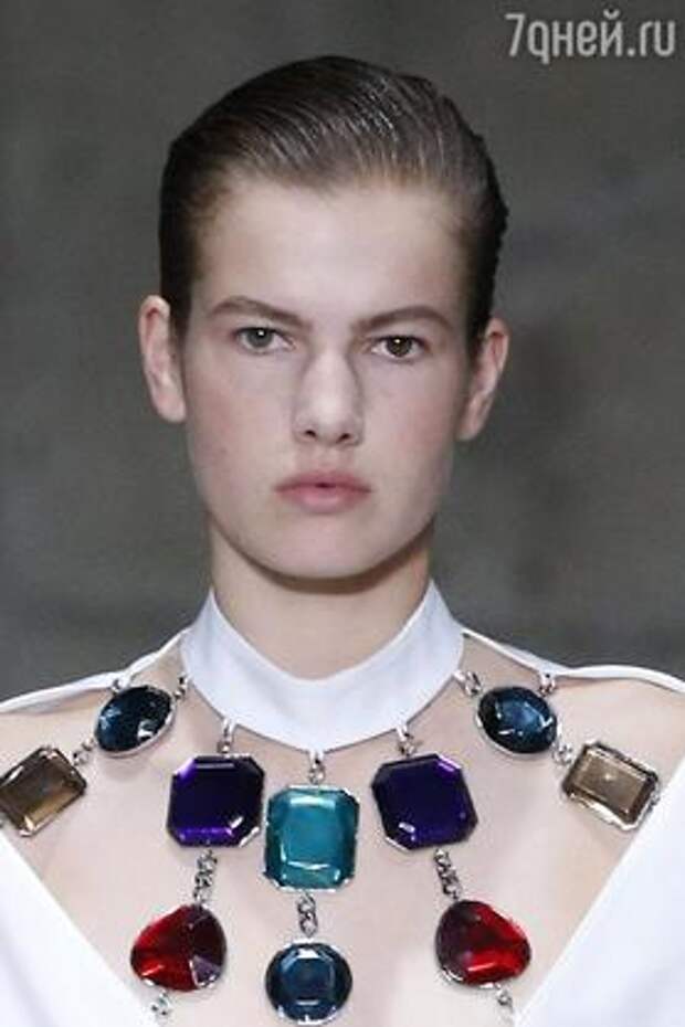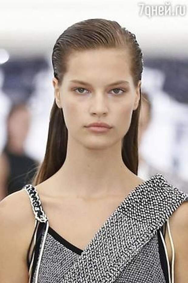 На шоу Christopher Kane Гвидо Палау взял за основу тот же принцип создания укладки: уложил волосы маслом Diamond Oil Glow Dry, Redken, подчеркивая форму головы, и собрал пряди в низкий гладкий хвост.