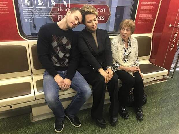 На фото: Поезд #ЧМ2018 сегодня вышел на Кольцевую линию. Первые пассажиры - Валентина Тимофеевна , вдова легендарного Льва Яшина, я да Игорь Акинфеев. Осторожно , двери закрываются, следующая станция ... поспать на Кольцевой - святое дело ! Московский метрополитен - такой же надёжный, как #Акинфеев! #цвбп