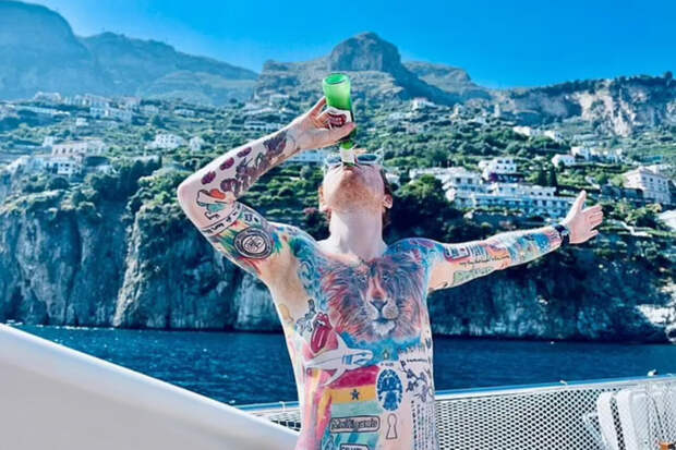 Его тело покрыто десятками татуировок в разных стилях: кресты, розы, животные, даты.