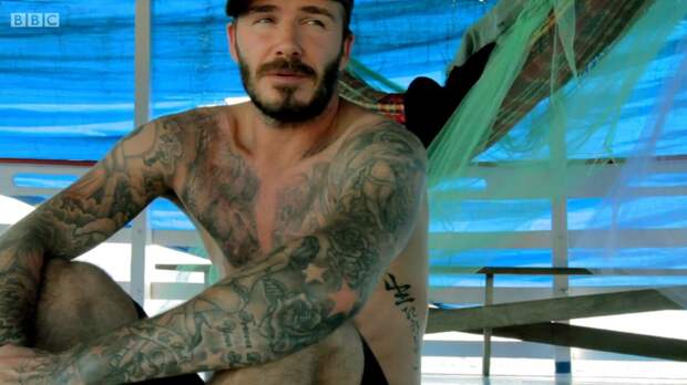 У него нет полноразмерных рукавов, зато есть небольшие «неловкие», нарочито простые рисунки — например, сердце с кинжалом, которое он делал сам.