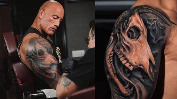 Его культовый «Brahma Bull» начинался как простая эмблема, но с ростом карьеры и личности Джонсон решил обновить ее. Сегодня на его руке — череп быка (bull skull) с трещинами и тонкими деталями, символизирующий пережитые уроки, испытания и силу, накопленную за годы. Под черепом мастер добавил волну, вдохновленную Гавайями: этот элемент служит «якорем», соединяющим энергию человека с природой и создающим баланс. Особое значение имеет и направление рогов: они устремлены вперед — знак упорства, движения и преодоления преград.