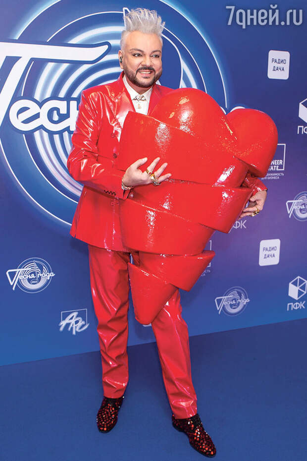 «На Филиппа Киркорова в последнее время обрушилась масса всяких неприятностей. Его 90-летний отец, как я знаю, попал в больницу. Но на мероприятии Филипп выглядит радостным и довольным жизнью. Его костюм напоминает и о яркой малине, и о фуксии. Он близок к самому модному оттенку наступающего 2023 года — карминовому цвету. В руках реквизит — огромное сердце. Филипп смотрится моложаво, а ведь ему уже 55».