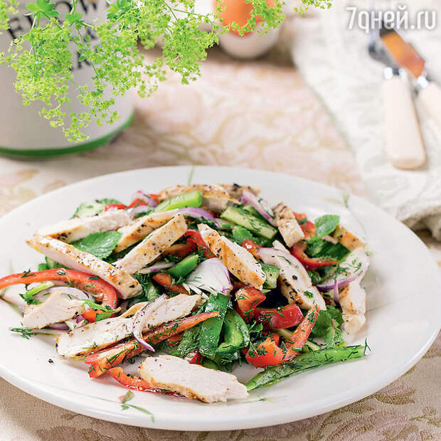 Куриную грудку посолить, поперчить и отбить с двух сторон. Разогреть в сковороде-гриль оливковое масло и жарить грудку с двух сторон до готовности. Сладкий перец, удалив плодоножки и семена, нарезать небольшими кусочками. Огурец нарезать маленькими кусочками. Лук почистить, нарезать тонкой соломкой и сбрызнуть лимонным соком. Листья мяты измельчить. Нарезанные овощи выложить в салатницу, сбрызнуть оливковым маслом extra virgin, посолить, поперчить, посыпать мятой и перемешать. Обжаренную куриную грудку нарезать тонкими полосками, добавить в салат и еще раз все перемешать. Укроп мелко порубить и посыпать салат.