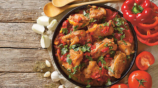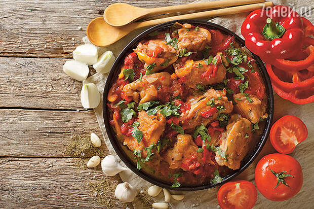 Чахохбили из куриных бедер: классический рецепт с томатной пастой в сковороде.