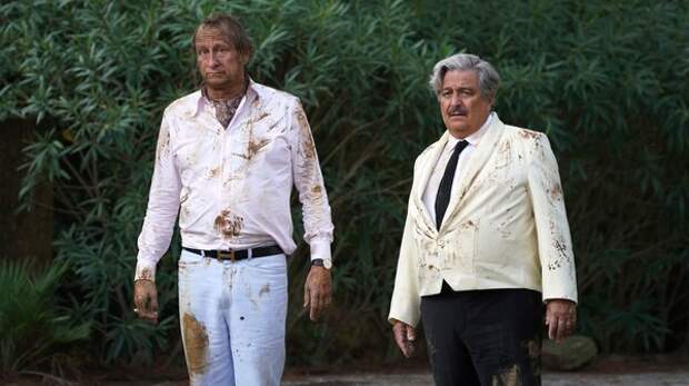 «Тайна Сен-Тропе»(2021) – комедия, совершенно не обязательная к просмотру, но задающая настроение, как какой-нибудь пошлый коктейль с вишенкой у кромки бассейна. Во-первых, действие происходит в 70-е, и почти все действующие лица – пародии на поп-культурные иконы. На виллу Траншана звонит Ален Делон, в гости к Траншану приезжает певец по имени Джо, внешне – копия Джо Дассена (мало того, он еще и хвастается тем, что увел подружку у «Джонни» — очевидно, что у Джонни Холлидея).
