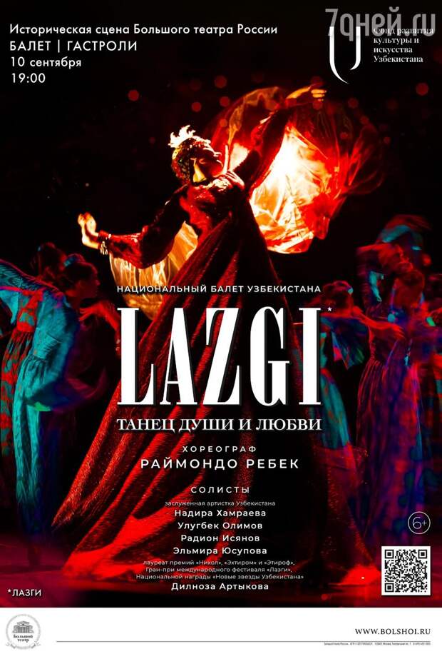 10 сентября 2023 года на Исторической сцене Большого театра при поддержке Фонда развития культуры и искусства Узбекистана гостям и жителям столицы будет представлен балетный спектакль «Лазги. Танец души и любви». Эффектная постановка известного немецкого хореографа и балетмейстера Рауля Раймондо Ребека посвящена древнему народному танцу лазги (лязги), который был включен ЮНЕСКО в список нематериального культурного наследия человечества.