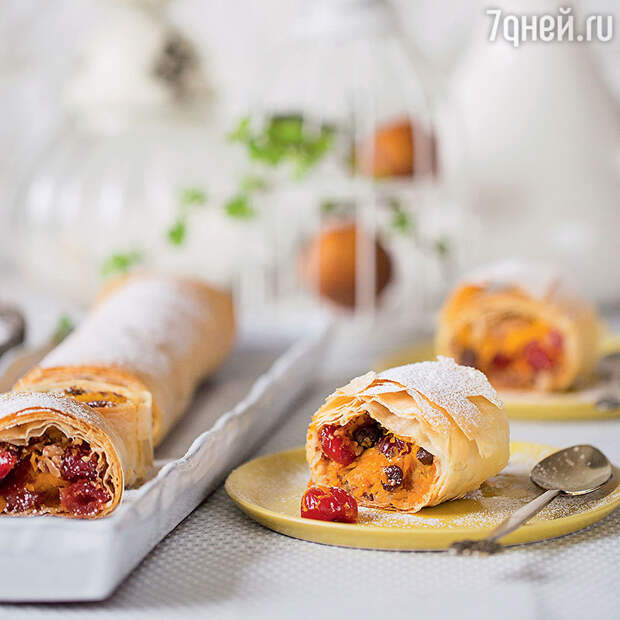 Духовку разогреть до 200 °С. Тыкву почистить и натереть на крупной терке (лучше в комбайне). Вишню и изюм залить ромом, перемешать и дать постоять. Стручки кардамона раздавить и вынуть зерна. Гвоздику, бадьян, мускатный орех и зерна кардамона растереть в ступке. Цедру апельсина натереть на мелкой терке. Миндаль и цедру апельсина добавить в ступку к специям и все измельчить так, чтобы остались маленькие кусочки миндаля. Три листа фило уложить один на другой, промазывая каждый оливковым маслом и слегка присыпая сахарной пудрой, сверху накрыть последним листом фило. Посыпать тесто частью орехов со специями и равномерно разложить сверху натертую тыкву. Изюм с вишней вынуть из алкоголя и выложить на тыкву, посыпать оставшимися орехами со специями, а потом 2 ст. л. сахарной пудры. Свернуть штрудель рулетом. Противень выстелить бумагой для выпечки, выложить штрудель, смазать его оливковым маслом и выпекать 20 минут. Готовый штрудель остудить и посыпать оставшейся сахарной пудрой.