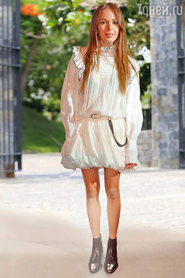 «Снова короткая юбочка, на ней надписи. В переводе с английского они примерно означают «на старт, внимание, марш!». Логомания сейчас в моде и часто используется дизайнерами. Критикую обувь — она утяжеляет ногу. Агния гораздо лучше смотрится в открытых босоножках».