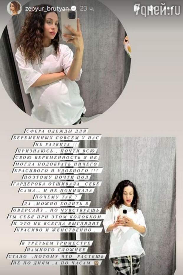 Актриса пожаловалась подписчикам, что сильно поправилась и не могла подобрать себе красивые платья, юбки и брюки для беременных. В итоге Брутян вынуждена была или надевать что-то свободного кроя, или шить самостоятельно, чтобы не выглядеть колобком.