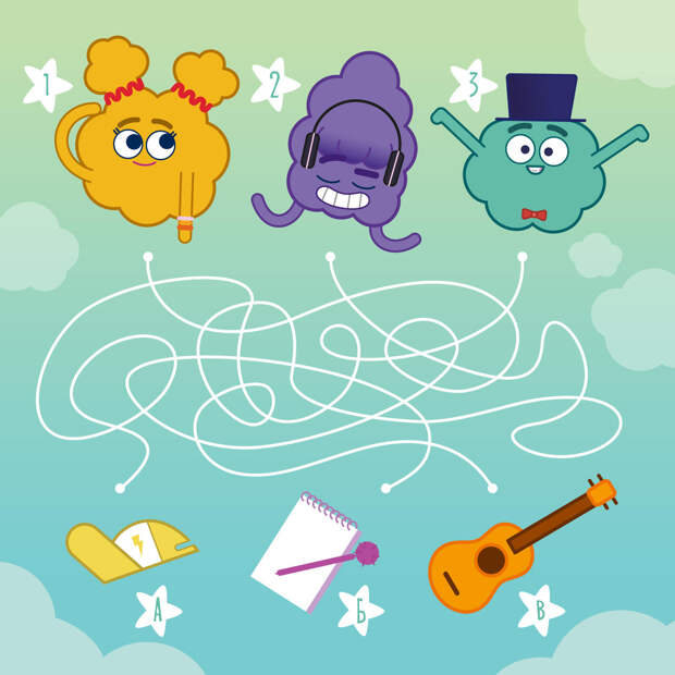 Не торопитесь поправлять малыша – порой его логика может быть действительно интересной и удивительной.Попросите ребенка рассмотреть изображения в верхнем и нижнем рядах. Знает ли он, что на картинке? Может ли он предугадать заранее, какие предметы кому принадлежат? А теперь предложите «распутать» линии и узнать, прав он или нет.