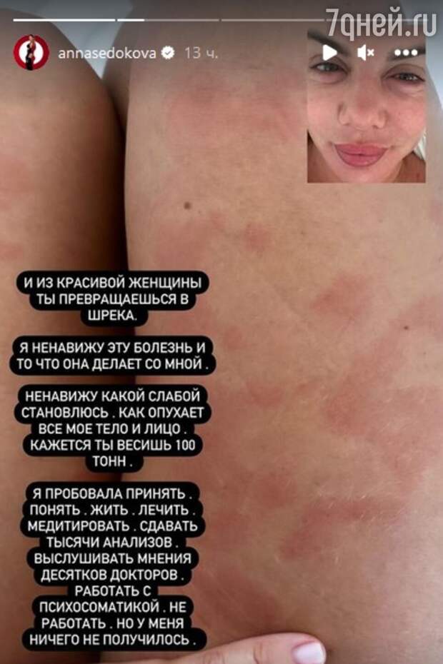 Все дело в неизлечимой болезни экс-солистки «ВИА Гры», которой она страдает уже давно. Седокова не скрывает от подписчиков, что ее мучают приступы сильной крапивницы — тело и лицо певицы опухают и покрываются болезненными красными пятнами. Артистка испробовала множество средств от тяжелого недуга, даже покупала в Штатах дорогостоящие уколы, но избавиться от крапивницы пока не смогла.