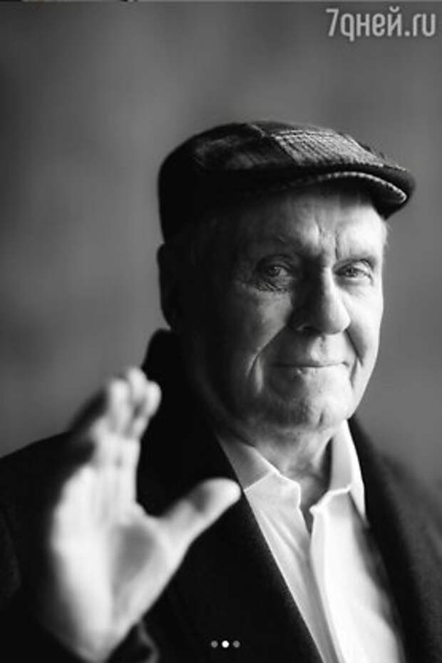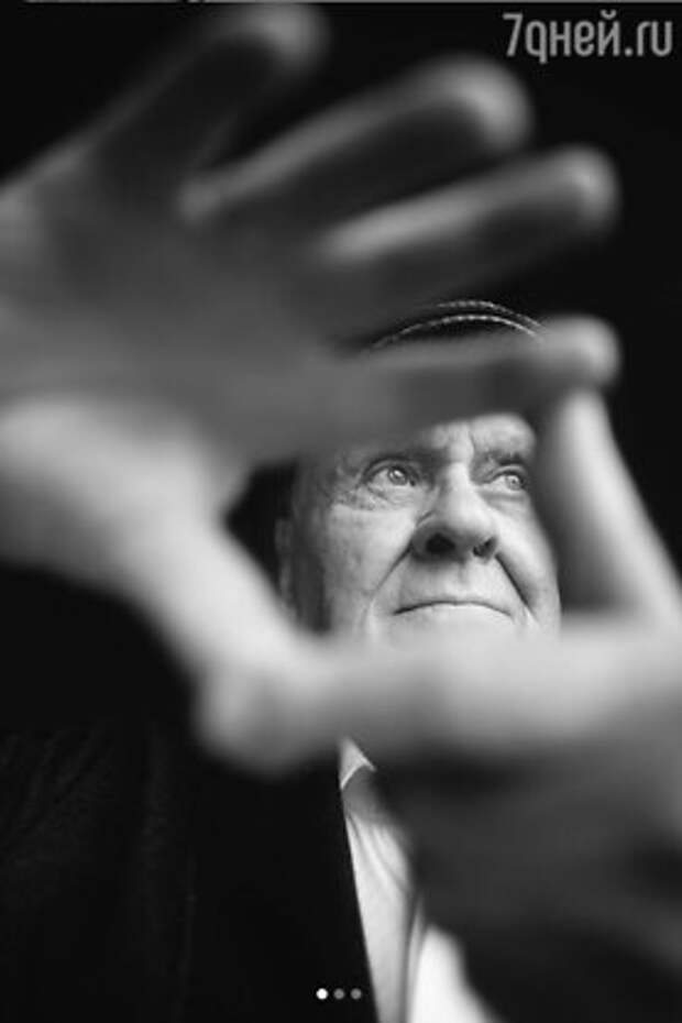 Его дочь Юлия Меньшова опубликовала черно-белые снимки папы — на одном он поднял руку в прощальном жесте, на другом — словно сам показывает, как правильно выстроить кадр.