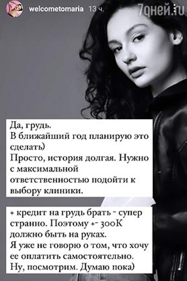 Как рассказала Мария, она думает о том, чтобы исправить свою грудь. Она серьезно готовится к этому шагу: ищет лучших врачей и откладывает деньги. Модель рассчитывает, что потратит на хирургическое вмешательство около 300 тысяч рублей. Дочь актрисы уверена, что пользоваться услугами банков и брать кредит на эту историю было бы очень странно.