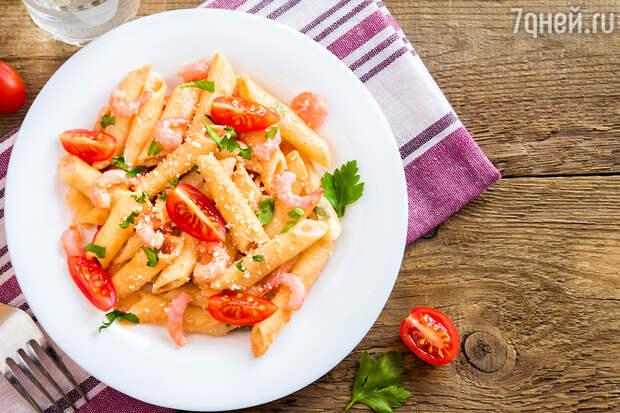 - Переложите пасту к обжаренным овощам и морепродуктам.