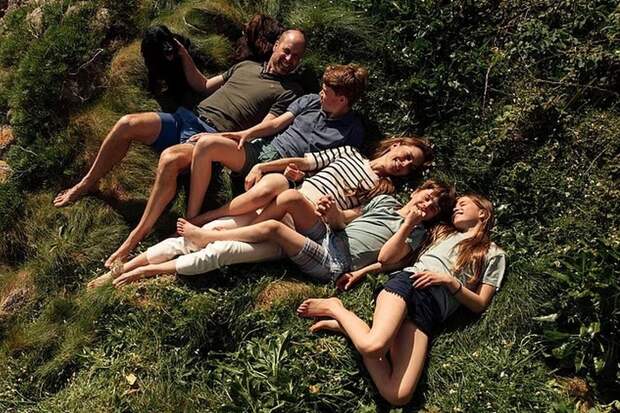 Однако в этом году празднование «хрустальной свадьбы», как называют в Британии 15-летнюю годовщину бракосочетания, прошло без какого-либо пафоса — они тихо отметили дату в семейном кругу. Что же касается фото, которым они поделились по этому поводу, то оно было сделано прошлым летом в графстве Корноулл, а его автором стал любимый фотограф Кейт и Уильяма – Мэтт Портеус. На этом живописном снимке все семейство – принца с принцессой, 12-летнего Джорджа, 10-летнюю Шарлотту и 8-летнего Луи запечатлели запросто лежащими прямо на траве — на зеленой лужайке. А рядом с Уильямом удобно расположились еще два полноправных члена семьи, каковыми Кейт и Уильям считают своих питомцев — два пса-спаниеля.