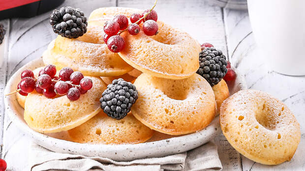 - Посыпьте чуть остывшие пончики сахарной пудрой и подавайте с ягодами или вареньем.