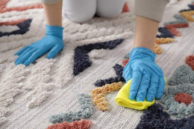- Смочите тряпку, хорошо отожмите и протрите ковер круговыми движениями.