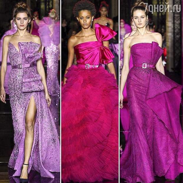Во-первых, сделана ставка на самые популярные цвета тех лет. В том числе и фуксию. Во-вторых, широкие плечи. Ну и, разумеется, восточная роскошь и вышивки ручной работы. Без этого дизайнер ливанского происхождения не обходится никогда.Интересно, сможем ли мы увидеть Лопес или других постоянных клиенток марки в платьях подобного цвета на красных дорожках в самое ближайшее время? Захотят ли они такой вопиющей яркости?