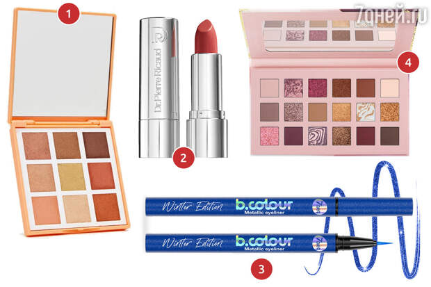 1. Палетка теней для век 3INA The Sunset Eyeshadow Palette. 2. Увлажняющая помада Dr. Pierre Ricaud. 3. Подводка-лайнер Metallic Eyeliner 7days. 4. Палетка теней для век Daring Nude Eyeshadow Palette Catrice.