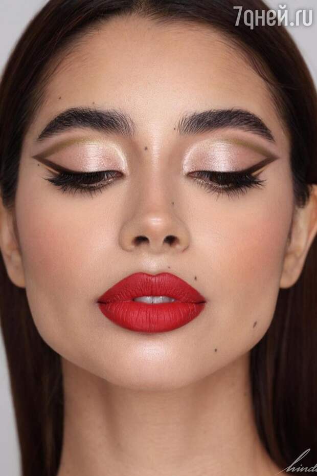 Прошли те времена, когда в макияже мог быть только один акцент. Яркий мейкап губ в винных, красных или ягодных тонах рекомендуют смело сочетать с кошачьими стрелками или смоки айз, даже в дымчатых тонах. Для праздника то, что нужно.