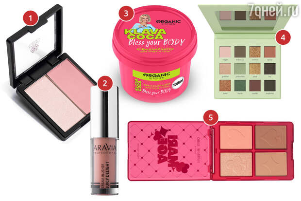 1. Палетка румян Kristall Minerals cosmetics. 2. Кремовые румяна Aravia. 3. Крем-хайлайтер для лица и тела Klava Coca Organic Kitchen. 4. Палетка теней ROYAL GARDEN Divage. 5. Палетка для контурирования Mariage Face Palette Cirque Fantastique Vivienne Sabo.