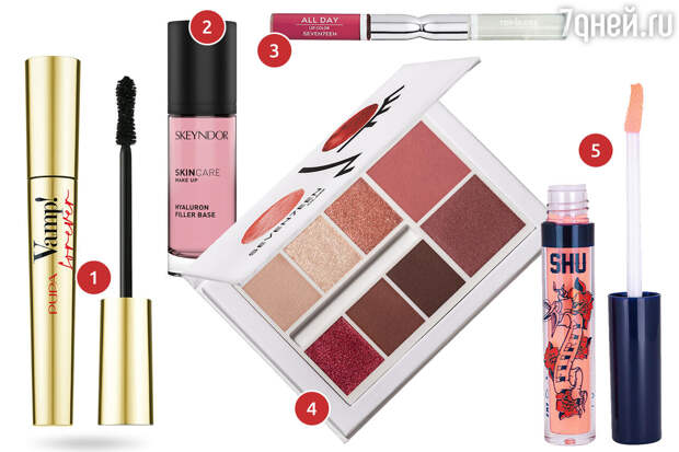 1. Тушь Vamp Forever Pupa. 2. Гиалуроновая база под макияж Skeyndor. 3. Двухсторонняя помад All Day Seven7een. 4. Палетка для макияж глаз и лица GLAM Seven7een. 5. Блеск для губ Flirty Shu.