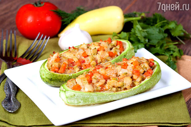 - Фаршированные кабачки, украшенные сверху «моццареллой», разложить на противне и запекать 20 минут при 200 градусах.