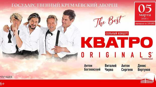 5 марта 2026 года, в преддверии Международного женского дня, вокальная группа КВАТРО ORIGINALS выступит с праздничным концертом на главной сцене страны, в Государственном Кремлевском дворце. Любимые миллионами Антон Сергеев, Антон Боглевский, Виталий Чирва и Денис Вертунов, лидеры жанра классического кроссовера, посвятят этот вечер прекрасным женщинам, исполнив лучшие классические произведения, зажигательные каверы и авторские хиты группы.