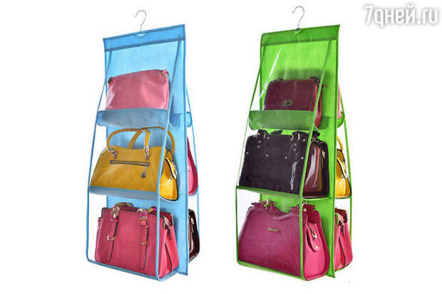 Прозрачный подвесной органайзер с полочками, в котором можно хранить различные предметы гардероба, например, дамские сумочки или обувь.