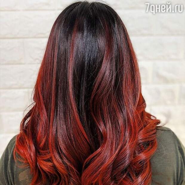 Темные и даже черные волосы – идеальный фон для экспериментов с яркими оттенками, например с рыжим, или сочетания тонов из этой палитры. От середины длины наносят красный, а ближе к кончикам огненно-рыжий.