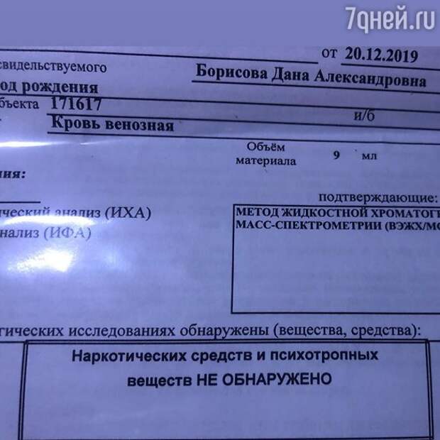 Телеведущая отметила, что все эти действия со стороны экс-супруга были прямым следствием нового конфликта с дочерью-подростком. Звезда телевидения так и заявила, что «у дочери очередной кризис».Тогда отец Полины назвал Борисову «наркоманкой», из-за чего Дана была готова прямо там сдать все необходимые анализы, чтобы доказать обратное. Вслед за бывшим мужем обвинения стали поступать и от пользователей в соцсетях, и от СМИ. Возмущенная подобными заявлениями, телеведущая решила сделать необходимые тесты, доказывающие, что в ее организме запрещенных веществ нет. Дана даже предоставила скриншоты результатов, но они не впечатлили пользователей.