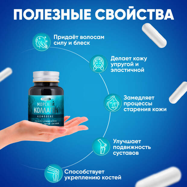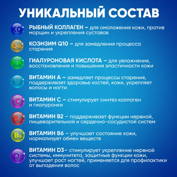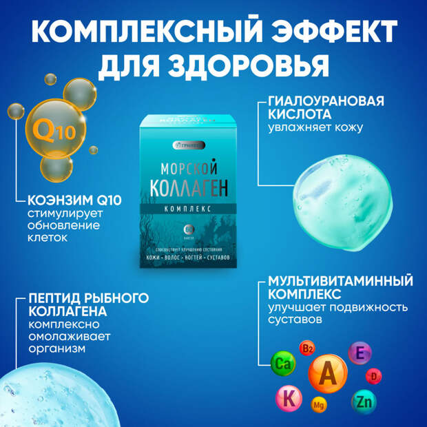 Главный компонент комплекса — это пептиды рыбного коллагена. Почему именно рыбного? Такой коллаген максимально биодоступен, то есть лучше всего усваивается организмом. Он обеспечивает увлажнение кожи, повышает ее эластичность и упругость, замедляет процессы старения.