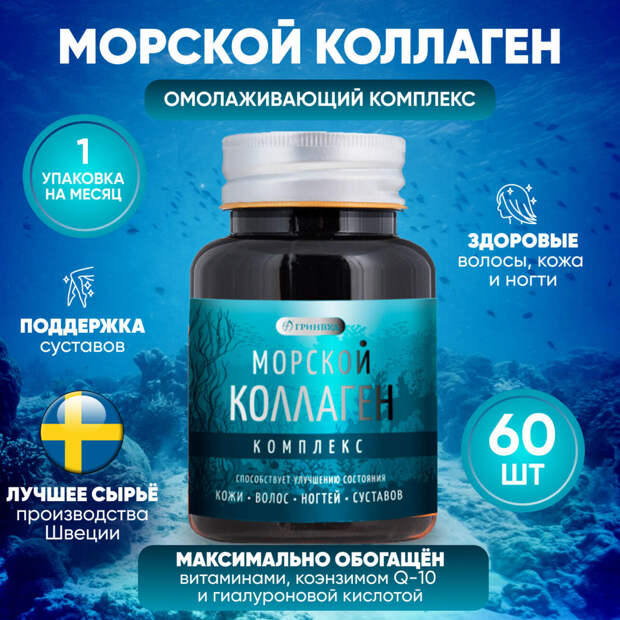 Морской коллаген — ваш помощник на пути к шикарной внешности, а в КОМПЛЕКСЕ МОРСКОЙ КОЛЛАГЕН ГРИНВУД уже собраны все необходимые компоненты и витамины для красоты, молодости и здоровья!