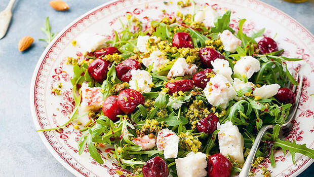 Салат тщательно промыть, большие листья порвать руками, все красиво разложить на большие порционные тарелки. Орешки обжарить на сковороде без масла в течение минуты. У черешни удалить косточки. Сыр порезать небольшими кубиками. Выложить на листья салата черешню и сыр, посыпать их кедровыми орешками и мелкопорубленной зеленью, поперчить (соли этот салат не требует). Сделать заправку: смешать сок половины лимона, мед и оливковое масло и хорошо перемешать. Полить заправкой салат и осторожно перемешать.