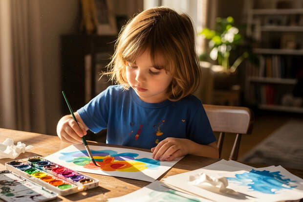 Можно обмакивать в краску и оставлять отпечатки на бумаге листьями, деталями от конструктора, кусочками овощей, собственной ладошкой или даже игрушечной машинкой. Участвуйте в этом процессе наравне с детьми: не показывайте «как надо», а удивляйтесь вместе. Скажите: «Ого, смотри, какой след оставила эта шишка! А что будет, если смешать эти два цвета?» Ваша задача — не руководить, а быть внимательным зрителем и соучастником открытий. Не бойтесь легкого беспорядка: застелите стол клеенкой, а малыша оденьте в одежду, которую не жалко испачкать.