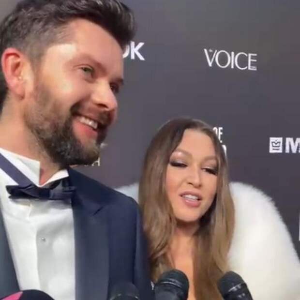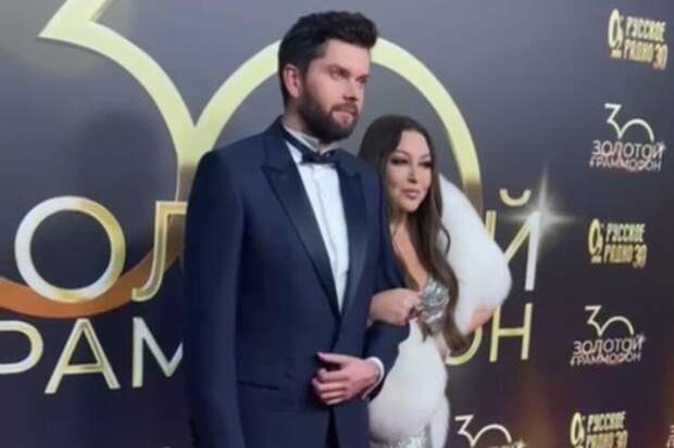 Артистка вышла к журналистам в блестящем наряде с меховой накидкой. Рядом с ней в этот момент находился Петренко, одетый в строгий черный костюм, белую рубашку и с бабочкой.