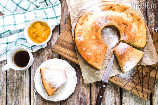По истечению времени достаньте форму из духовки и дайте пирогу 10 минут чтобы остыть. Аккуратно достаньте его из формы лопаткой. Порежьте на порционные куски и подавайте на стол. Украсить десерт можно взбитыми сливками, сахарной пудрой, мятой или ягодами.