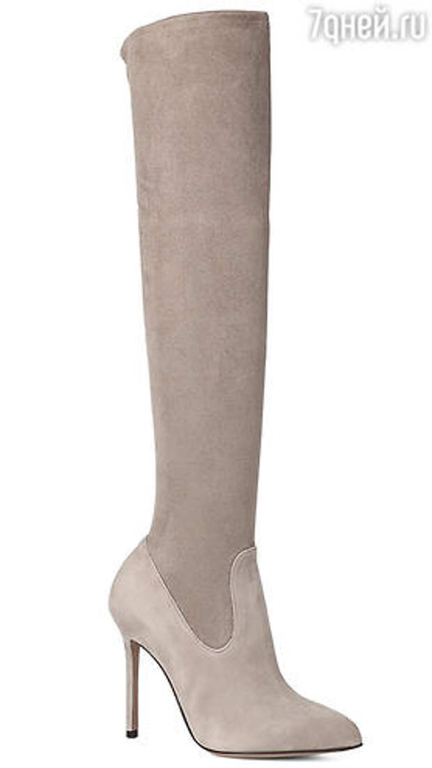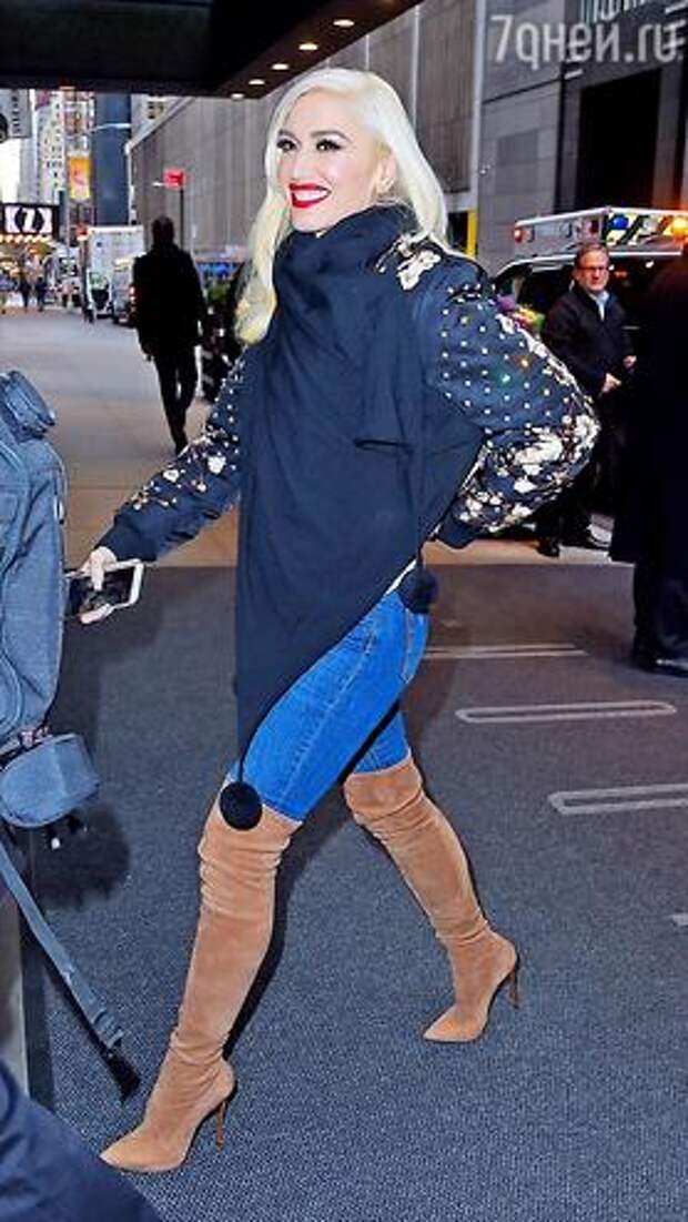 Главный must-have сезона – ботфорты разных цветов. Гвен Стефани выбрала модель из замши песочного цвета на тонкой шпильке с острым носом. Их неоспоримое достоинство? Они обтягивают ногу как чулки. Модели светло-серых и бежевых оттенков особенно актуальны. С чем носить? Конечно, же с джинсами. Сверху можно надеть объемный свитер,